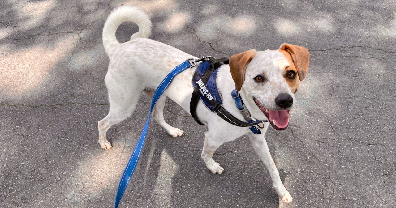 A white dog with solid brown on his ears and one side of his face and brown ticking on his body is wearing a blue harness and attached leash. He is trotting on pavement toward the camera with his mouth open and his eyes soft, looking happy.