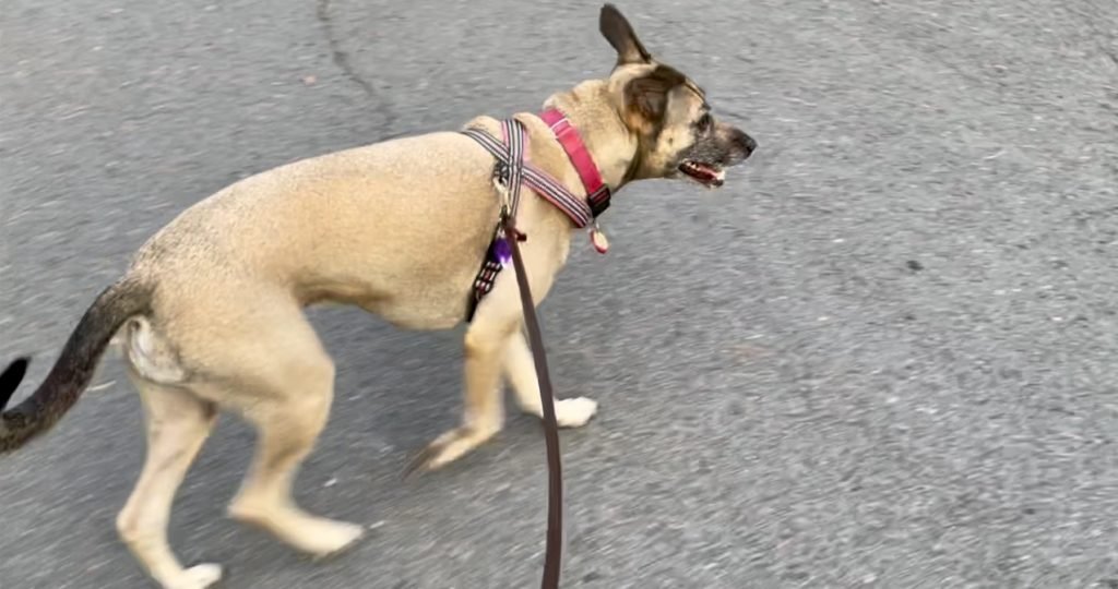 A tan dog with black on her face and tail trots on the pavement. Her mouth is open and she looks happy. She is on leash and the leash is attached to a harness.