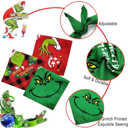 【3Pieces Christmas Grinch Bandanas 】Set Include “Grinch hand” red Christmas dog bandana, “Grinch face” green pet scarf, “Grinch dress up Santa hat and Christmas wreath” buffalo plaid Xmas dog bandanas. 3 different appearance pet Christmas scarf fit for girls and boys. Classic Christmas colors Grinch dog costume with “Merry Christmas” is ideal christmas gift for your pet.